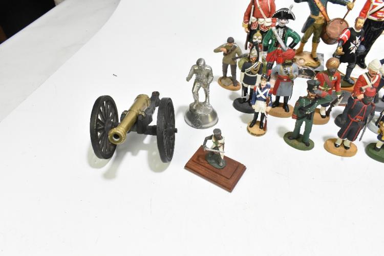 Lot 66A of 1434: MICHAEL SUTTY PORCELAIN MANUFACTORY; four limited edition hand modelled and painted military figures comprising 'Private Thomas Beech V.C 55th Regiment 1854', 10/250, 'Drummer, 1st Bn, The King's Own Royal Border Regiment 1984', 27/250, '4th (The King's Own) Regiment of Foot 1792', 68/250 and 'Drum Major 34th Regiment 1811', 77/250, approx thirty three further military figures including approx twenty four hand painted pewter Soldiers of the Queen examples, also three table top cannons.