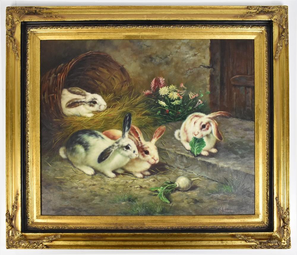 Lot 708 of 1434: N FOXMAN; oil on board, four rabbits in farmyard setting, signed lower right, 49 x 59cm, moulded gilt frame.