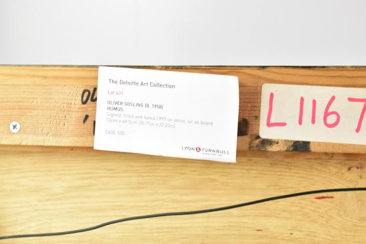 Lot 733 of 1434: OLIVER GOSLING (born 1958); oil on board 'Humus', signed with initials, signed, titled and dated 1997 verso, 53 x 69.5cm, framed. (D) Provenance: Private collection in Devon. Messrs Lyon & Turnbull, lot 431 'The Deloitte Art Collection'.