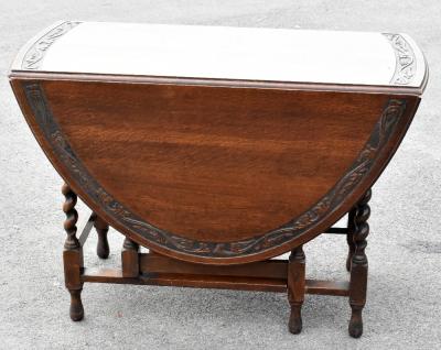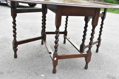 Lot 1213 of 1434: A 1920s carved oak gateleg table on barleytwist legs, height 72cm, width 107cm, with a similar set of four stained oak dining chairs with drop-in seats on barleytwist legs (5).