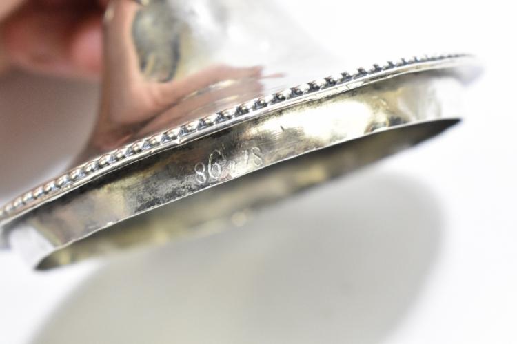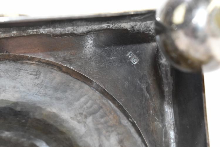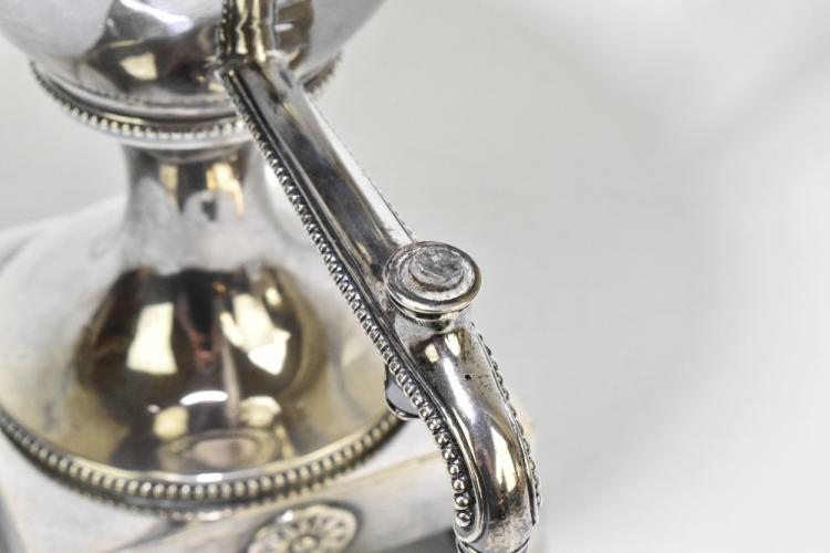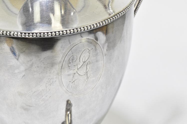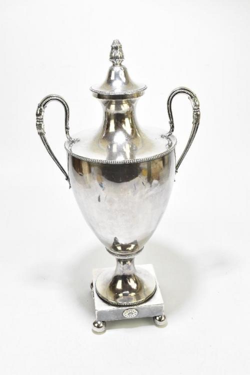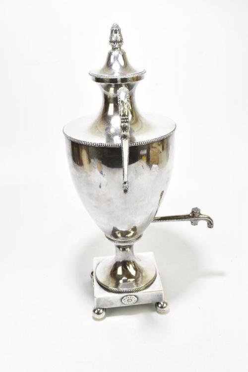 Lot 1 of 2356: HENRY CHAWNER; a large George III hallmarked silver twin handled tea urn and cover, the detachable cover with a cast finial, with beaded detail to the rims, the central oval cartouches with engraved initial 'G', raised on single column, terminating on a square plinth base with four floral cartouches and four ball feet, London 1817, height 53cm, approx weight 80ozt/2499.7g.
