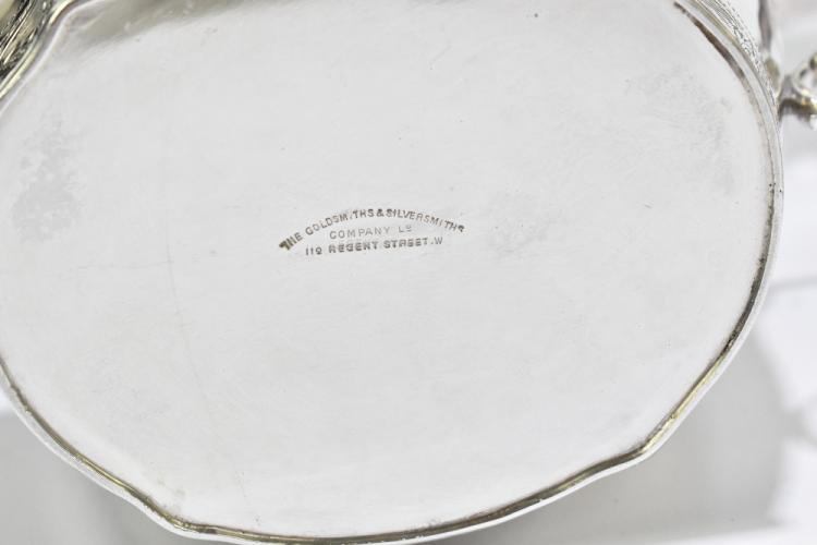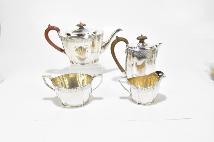 Lot 5 of 2356: A George V hallmarked silver four piece tea set with band of engraved detail to both upper and lower sections, the teapot inscribed 'Presented to Captain S.R. Macdonald by the officers of 1st. K.G.O. Gurkha rifles on the occasion of his marriage 1930', London 1929 and 1930, length of teapot 28cm, combined approx 47.4ozt/1475g.