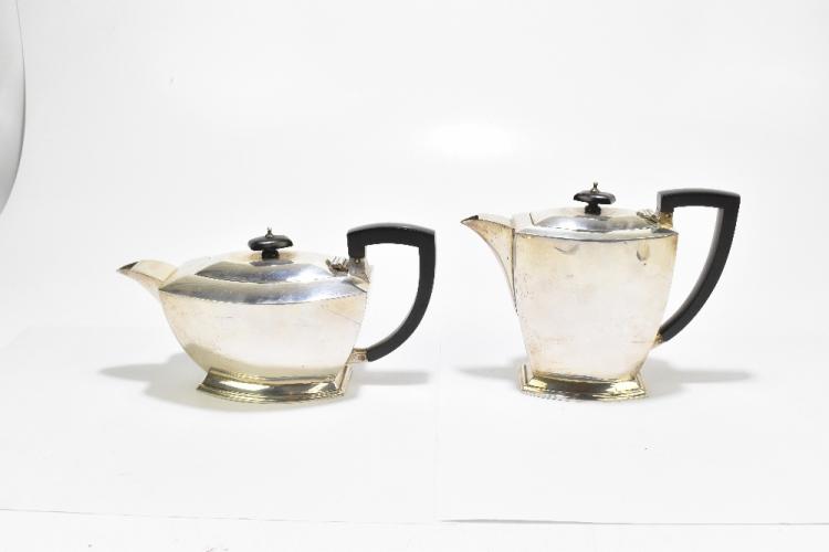 Lot 10 of 2356: S BLANCKENSEE & SONS LTD; a George VI hallmarked silver four piece tea set, comprising teapot, length 26cm, hot water pot, twin handled sugar bowl and cream jug, all with engraved initial capital 'B', Chester 1939, approx 50.9ozt/1584g (4).