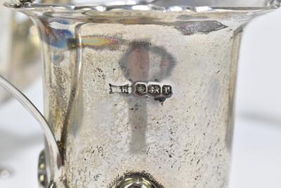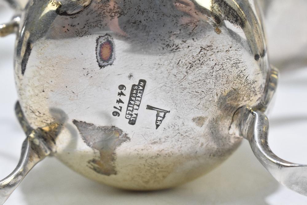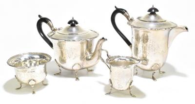 Lot 11 of 2356: WALKER & HALL; a George V hallmarked silver four piece tea set, Sheffield 1938, 1933 and 1934, comprising teapot and hot water pot with ebonised finials and handles, sugar bowl and milk jug, each on scroll feet, tallest 19cm, weight approx. 42ozt/1320g (4).
