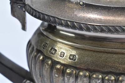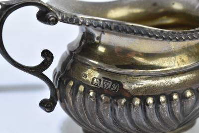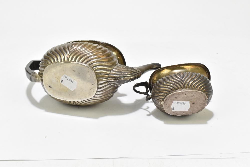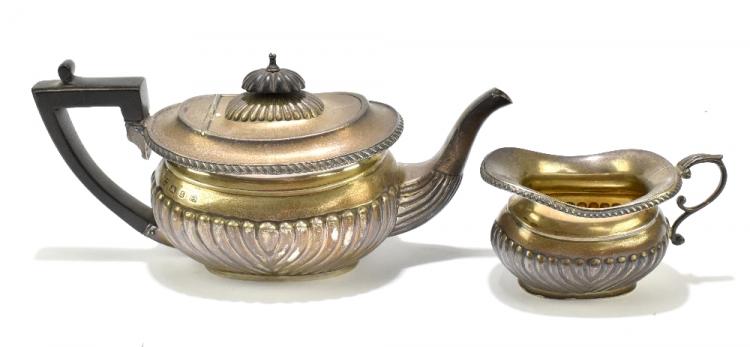 Lot 18 of 2356: A & J ZIMMERMAN; a Victorian hallmarked silver teapot with ebonised handle and gadrooned detail, Birmingham 1897, length 24cm  and a later similarly detailed cream jug, approx 15.7ozt/488g (2).