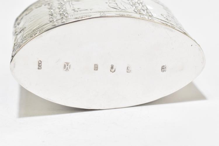Lot 30 of 2356: An Edwardian Dutch imported silver tea canister, with convex hinged lid and allover embossed decoration featuring figures and animals, import marks for Samuel Boyce or Boaz Landeck, Chester 1902, height 9cm, width 9cm, approx. 3.65ozt/114g.