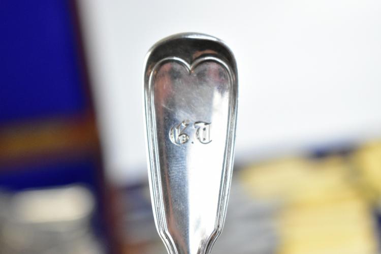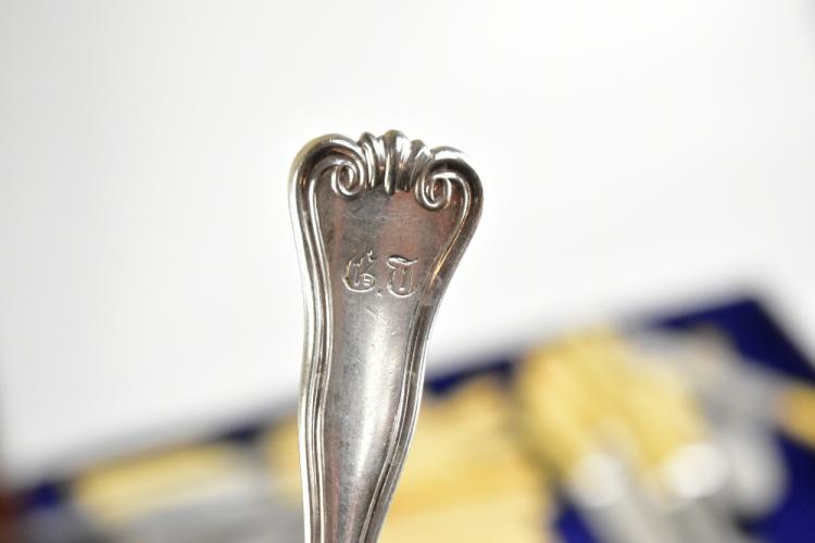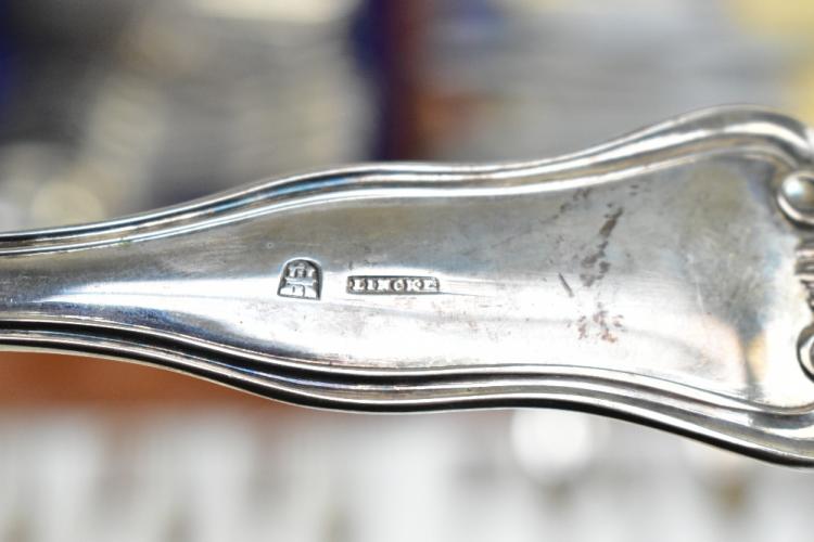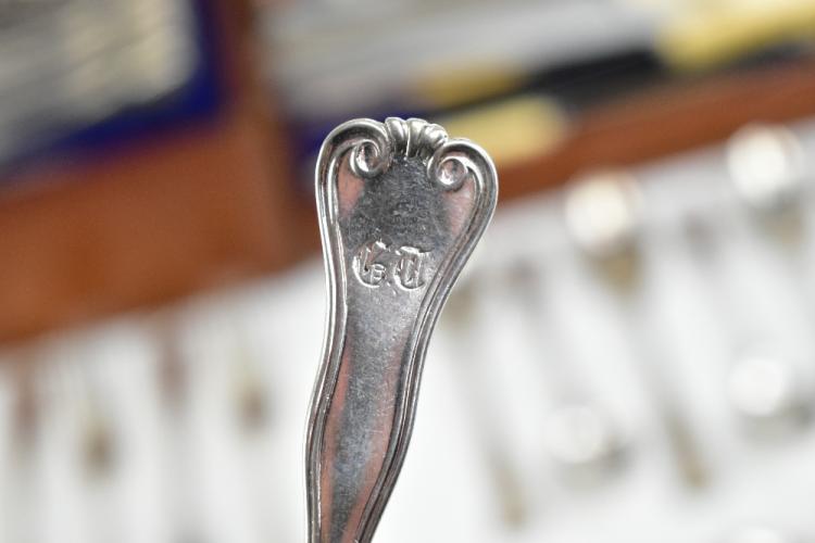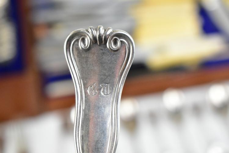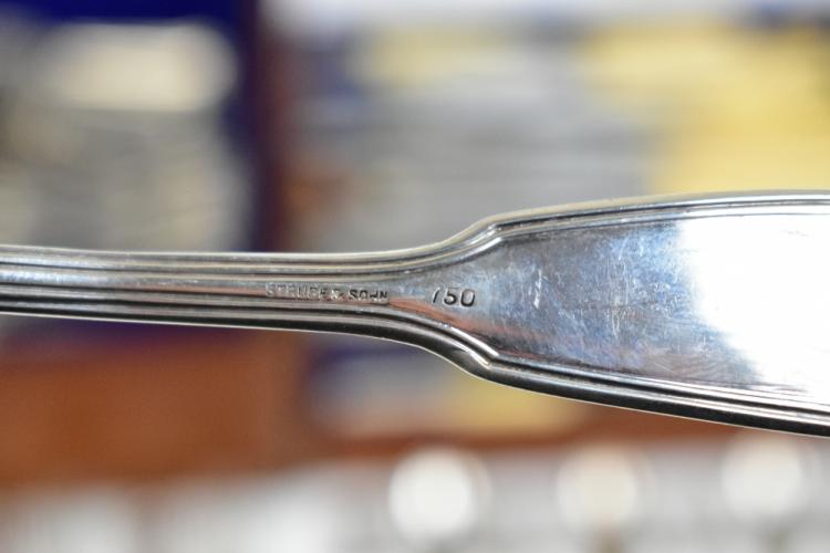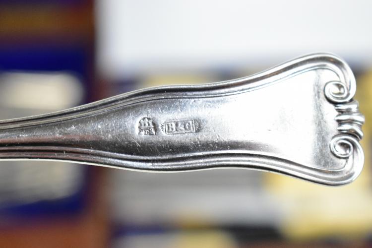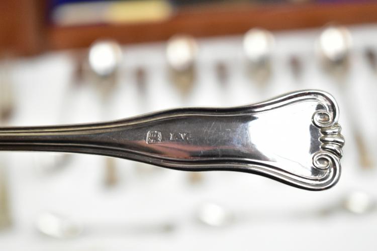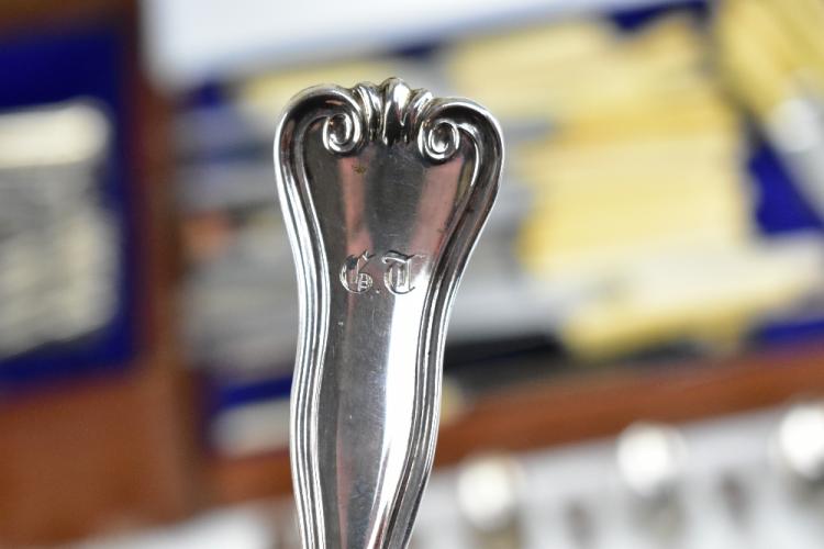 Lot 38 of 2356: A matched canteen of 19th century Hamburg silver flatware of shaped and scrolled design with engraved initials 'G.T.', comprising seventeen dessert spoons, eighteen serving spoons, three serving tools, seventeen dessert forks, eighteen teaspoons, four mustard spoons, eighteen table forks, a ladle and fifteen silver bladed sheath handled knives, various makers, the canteen with later plaque inscribed 'H.A.C. 30th July 1901', weighable approx 170.56ozt/5305g (excluding knives), also a group of sta