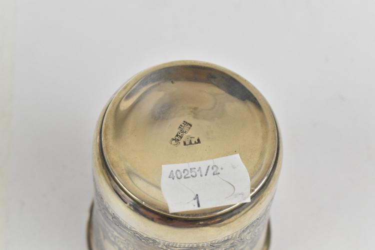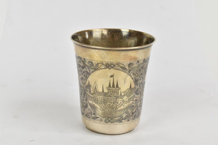 Lot 48 of 2356: A 19th century Russian hallmarked silver 84 Zolotnik and niello beaker, decorated with two circular views of buildings in between overall scrolling floral motifs, two marks at the rim and three marks to the underside of the base, maker's initials possibly MA, assayer's initials A.C above date 1875, height 9cm, weight approx. 3.5ozt/118g.