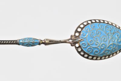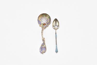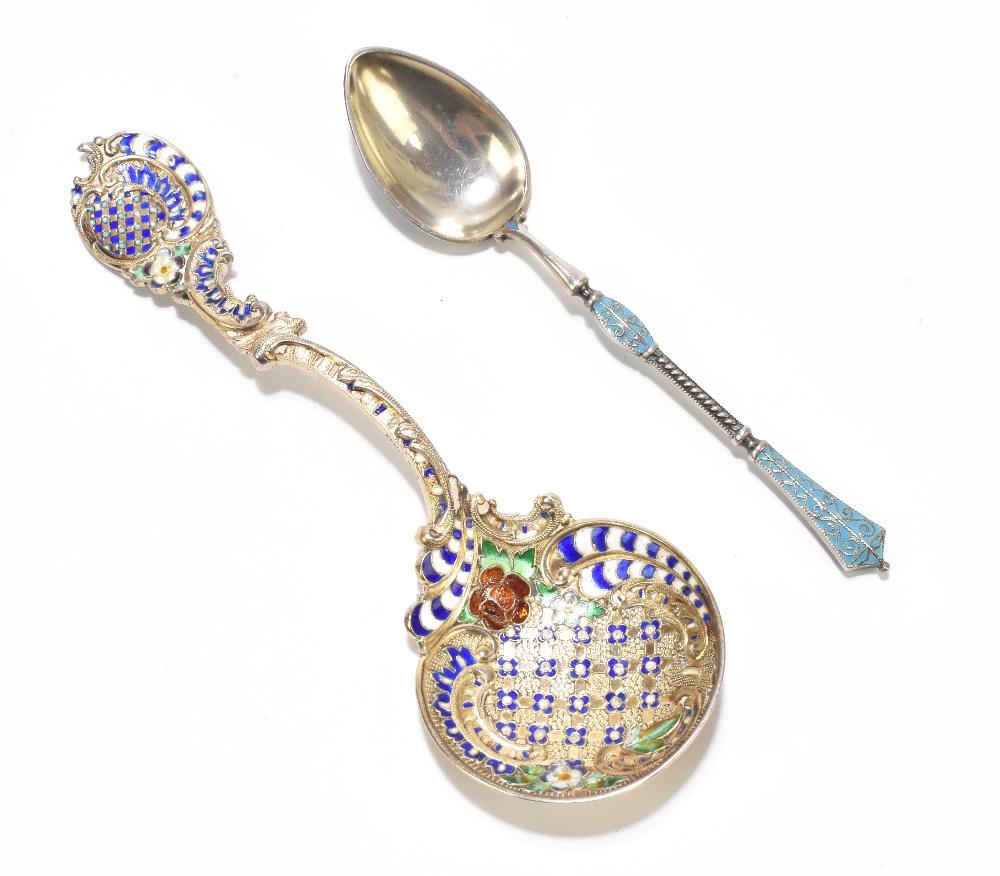 Lot 52 of 2356: A Russian sterling silver and enamelled teaspoon, the teardrop shaped bowl with blue and white enamel detail to the reverse and two enamel sections on the terminal, length 9.5cm, together with a white metal and enamelled spoon, the shaped terminal and circular bowl with floral and scrolling enamelled detail, apparently unmarked, length 11.5cm (2).