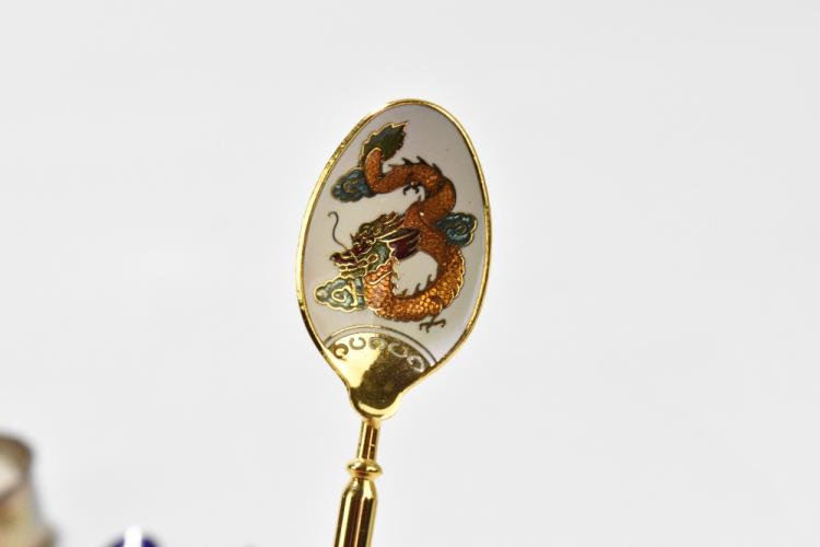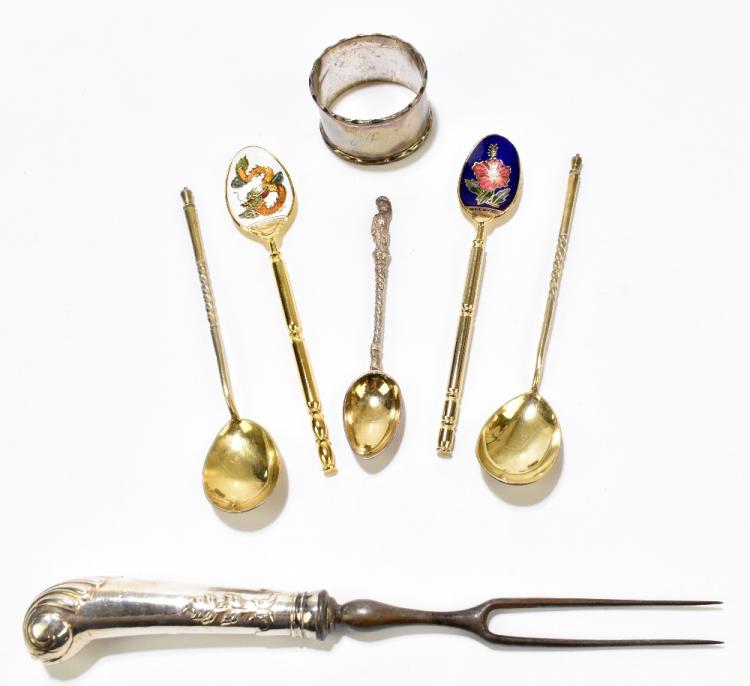 Lot 53 of 2356: A pair of Russian silver gilt spoons, the shaped bowls with chased floral decoration to the reverse and crown finials, length 13cm, together with a hallmarked silver napkin ring, a white metal mounted meat fork, two modern brass and enamel teaspoons and a silver plated apostle spoon, weighable 36.9g.