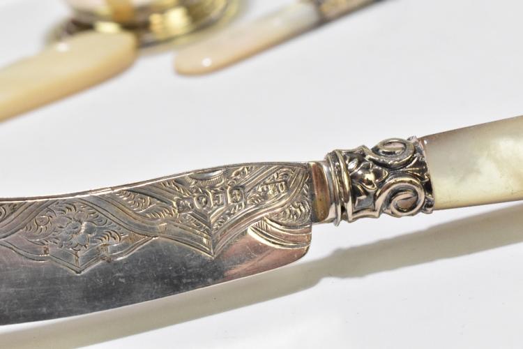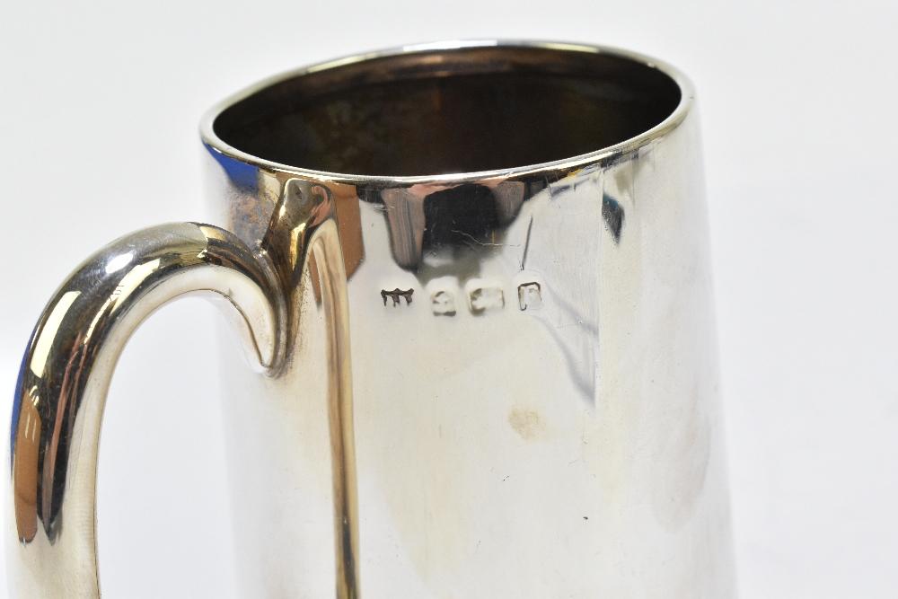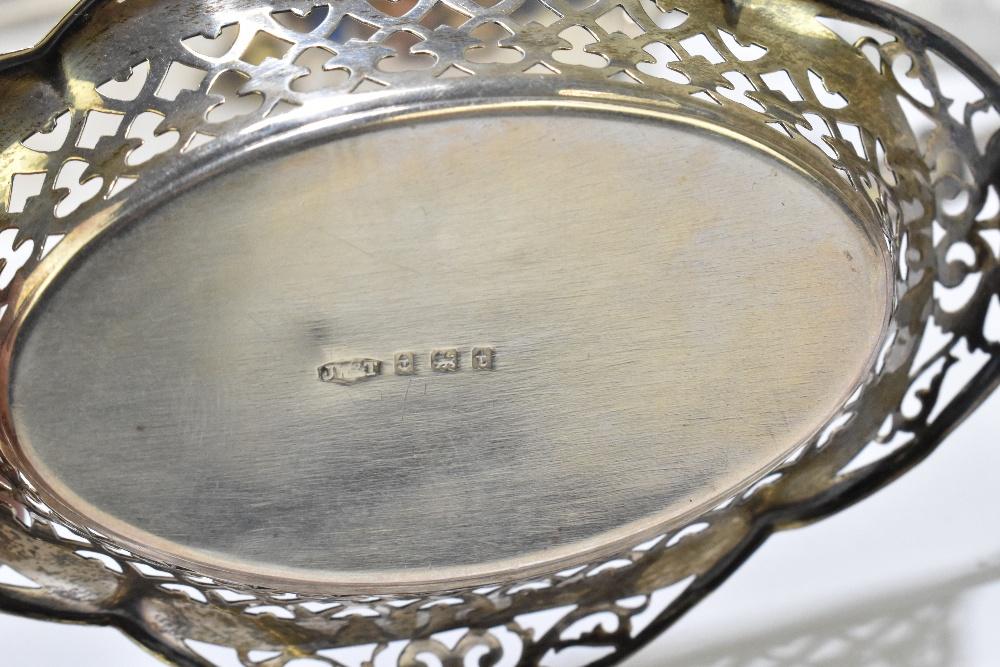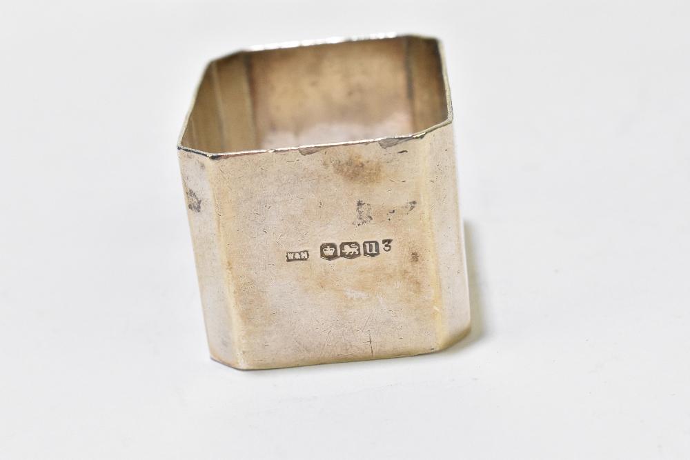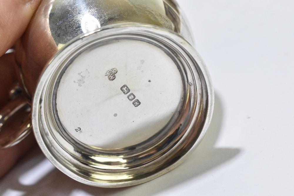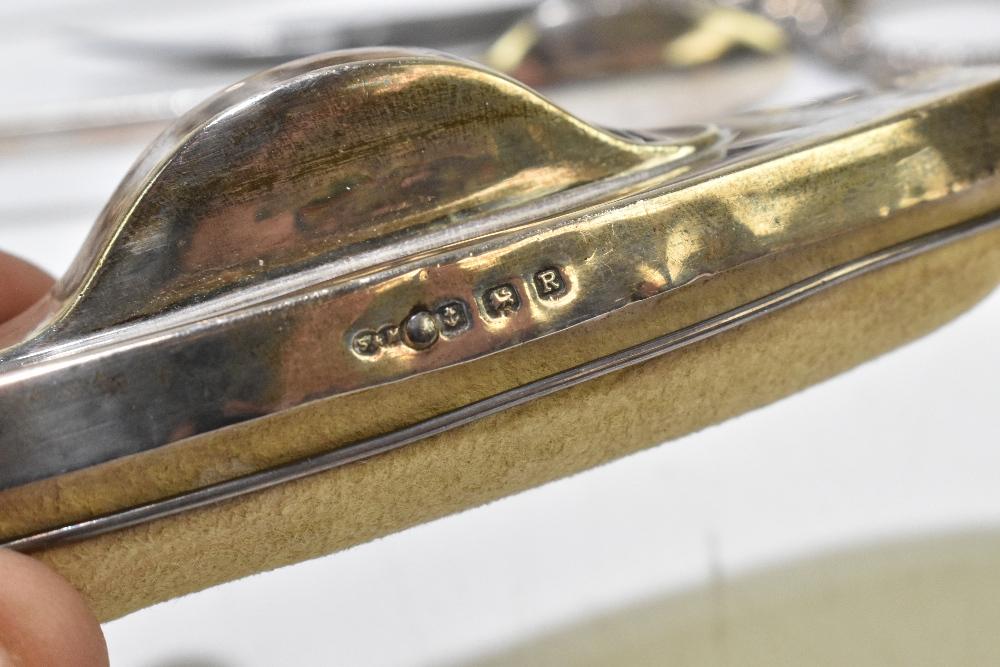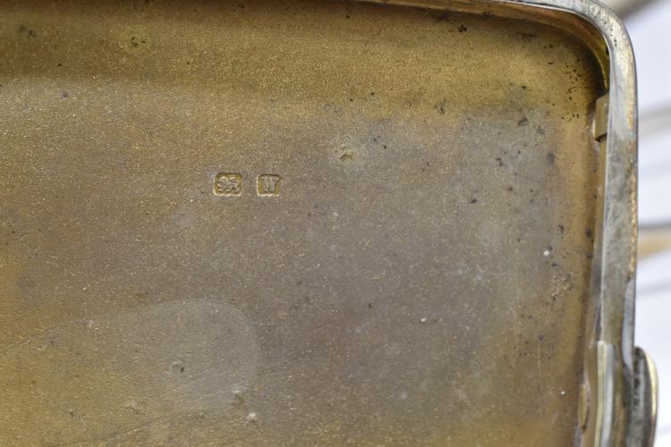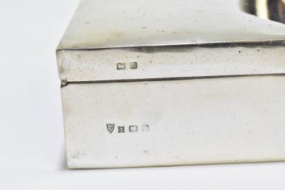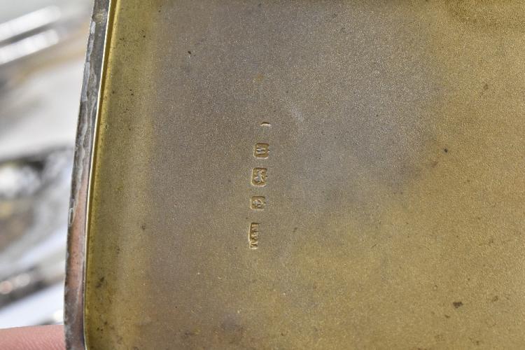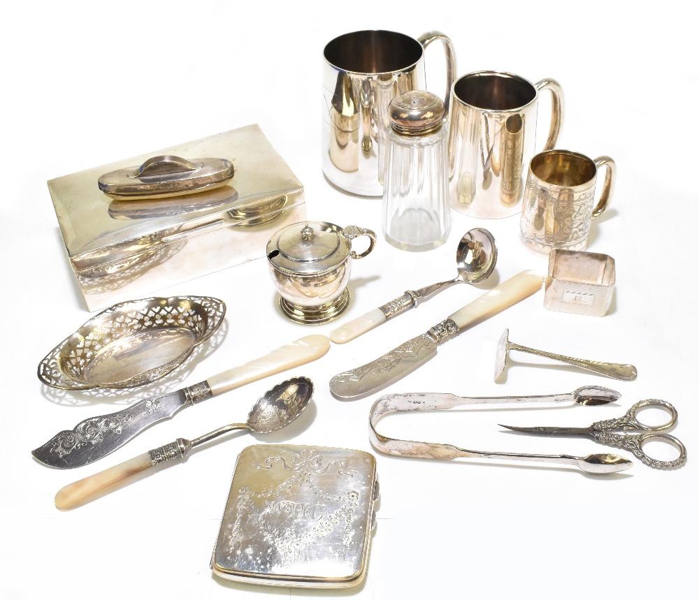 Lot 54 of 2356: A group of variously hallmarked silver items comprising a cigarette box, two Christening mugs, a mustard with blue glass liner, a cigarette case, a pierced dish, a single napkin ring, a silver topped vanity jar, a pair of sugar tongs, a pair of silver handled scissors and a silver mounted nail buffer, approx weighable silver 18.7ozt/583g, also a small group of silver plated items comprising a mug and loose flatware.