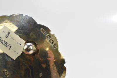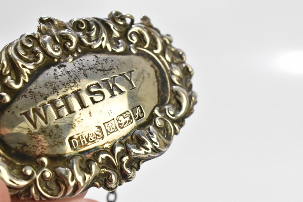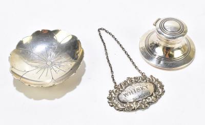 Lot 61 of 2356: ROBERTS & BELK; a George VI hallmarked silver leaf dish with chased decoration, Sheffield 1946, a hallmarked silver Capstan inkwell, and a hallmarked silver decanter label inscribed 'Whisky' (3).