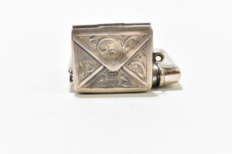 Lot 328 of 2356: An Edward VII hallmarked silver vesta case, Birmingham 1907 (makers mark's rubbed), and a single stamp box, Chester 1914 (maker's marks rubbed), approx 0.67ozt/19.1g (2).