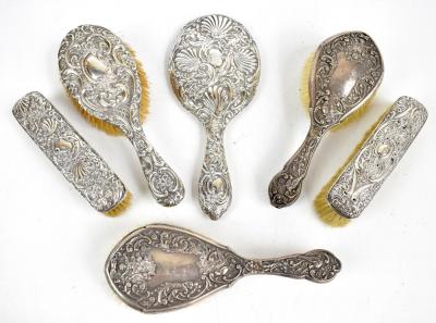 Lot 332 of 2356: L SPIERS (PROBABLY); a Victorian hallmarked silver back four piece dressing table set, comprising a hand mirror, a hair brush, two clothes brushes, each with repoussé decoration of floral and open shell detail surrounding shaped cartouches with engraved initials, Birmingham 1892, together with a pair of hallmarked silver backed hairbrushes (6).