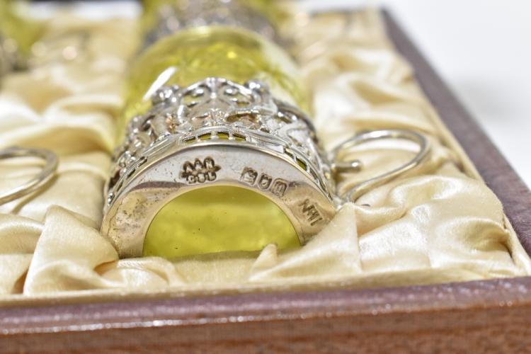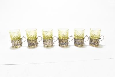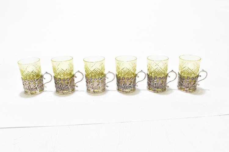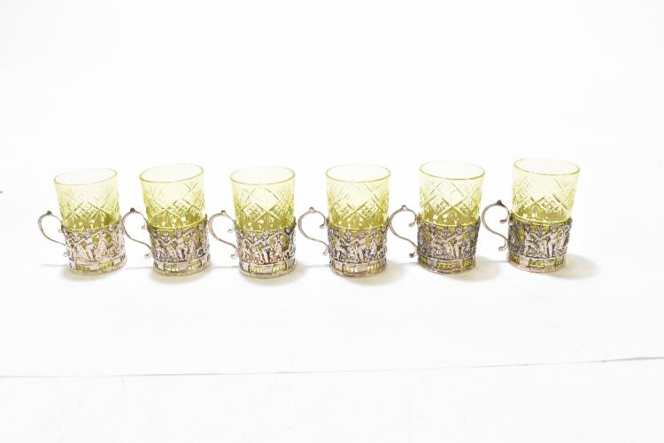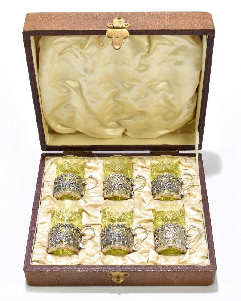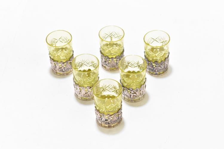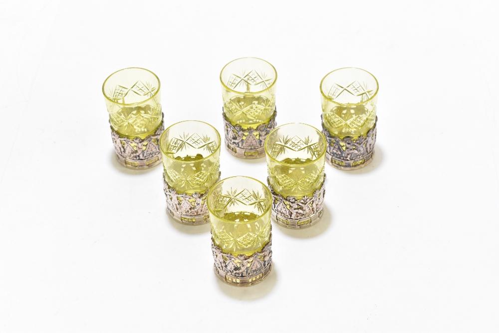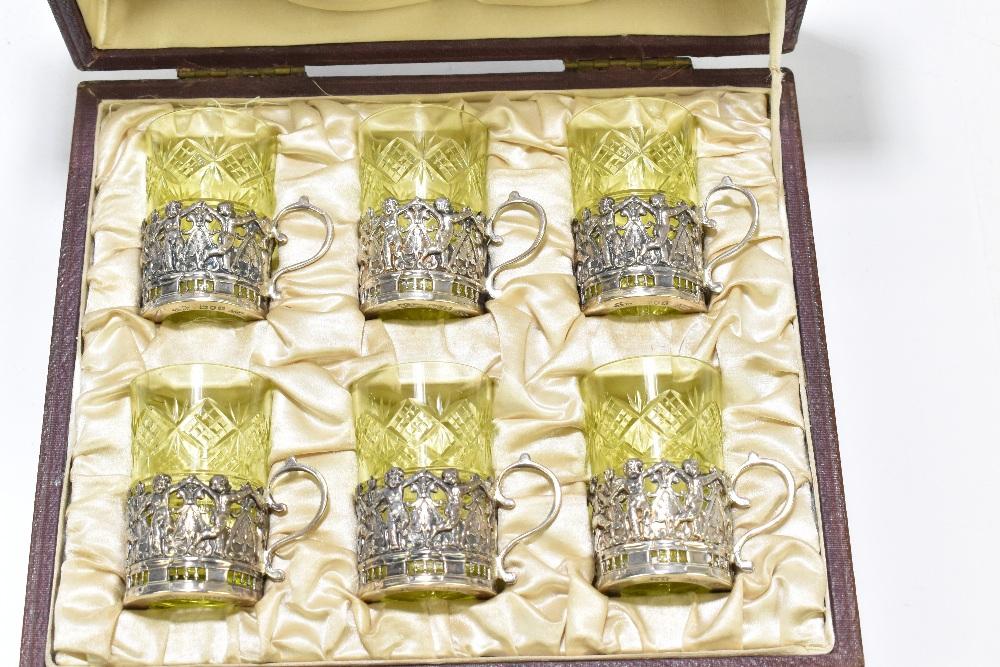 Lot 489 of 2356: ARMY & NAVY CO-OPERATIVE SOCIETY; a cased set of six Edward VII hallmarked silver mounted tot glasses, with green glass detachable liners, the silver decorated with dancing putti, London 1906 (6).