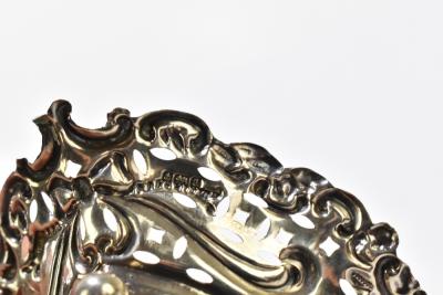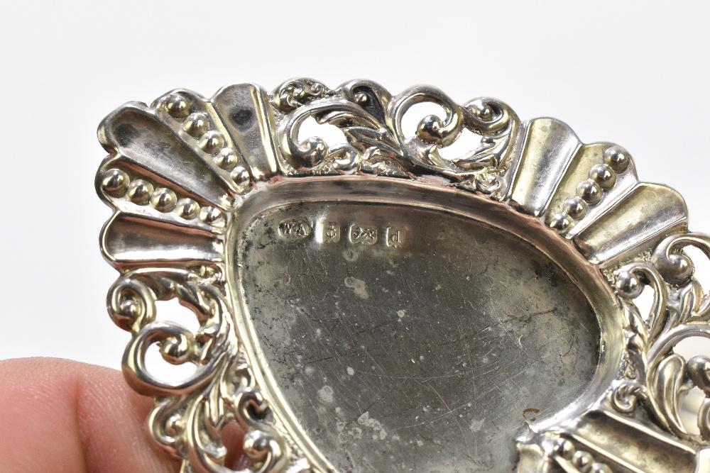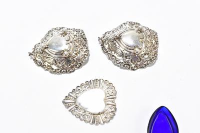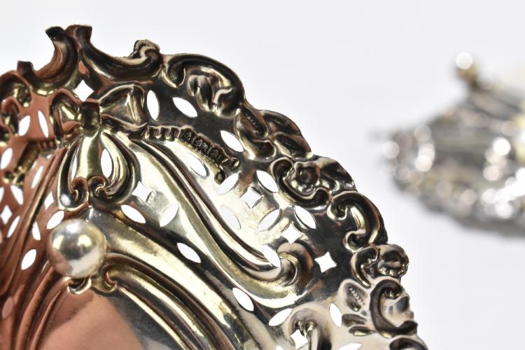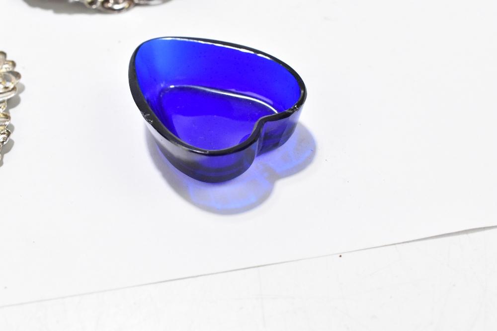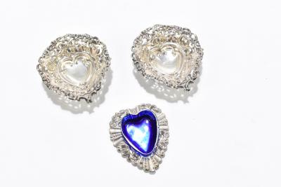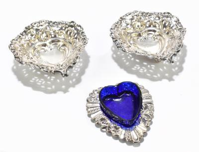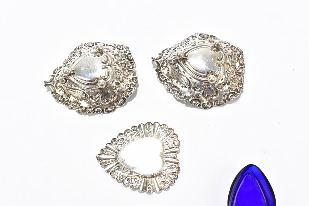 Lot 491 of 2356: WILLIAM DAVENPORT; a pair of late Victorian hallmarked silver bonbon dishes with pierced and cast detail with central bow, Birmingham 1900, together with a hallmarked silver heart shaped dish, with blue glass liner, Birmingham 1903 (3).