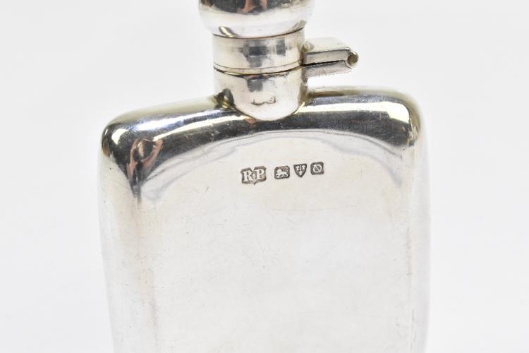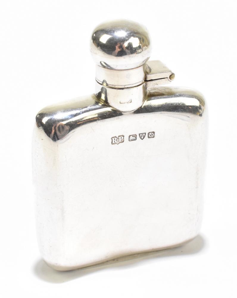 Lot 492 of 2356: ROBERT PRINGLE; a George V hallmarked silver hip flask of rounded rectangular form, Chester 1939, 9.5 x 6.8cm, approx. 2.4ozt/76g.