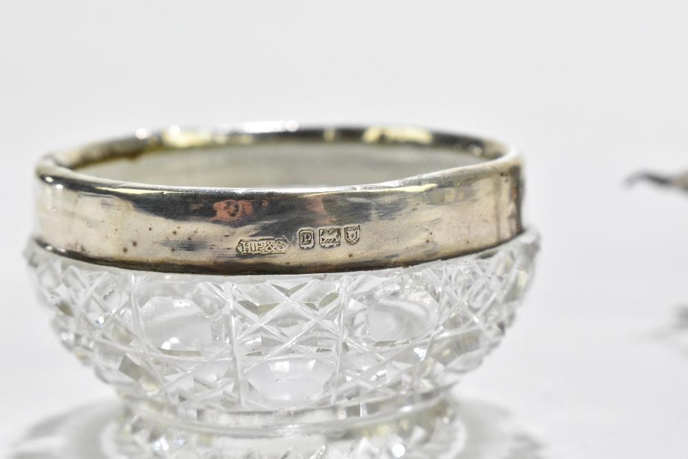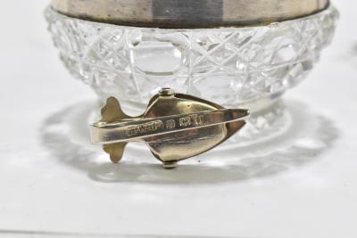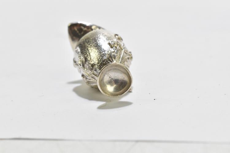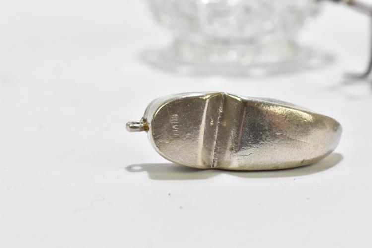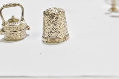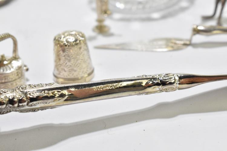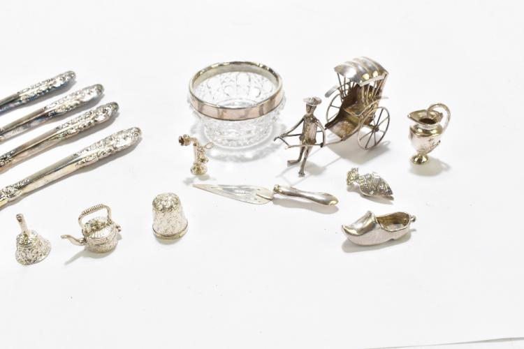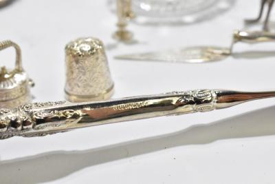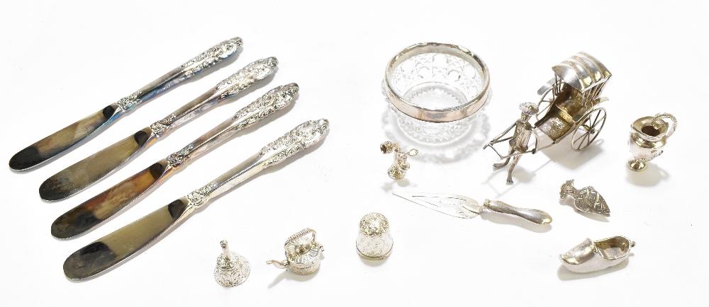 Lot 499 of 2356: A group of hallmarked silver and white metal, to include a page turner in the form of a trowel, by Ammonite Ltd, Birmingham 1925, a hallmarked silver paperclip, a Chinese white metal figure pulling a cart, impressed stamped and dated '85, a white metal model of clog and a miniature jug, stamped 'silver', a hallmarked silver thimble, a cut glass salt with hallmarked silver rim, three white metal charms and cased set of four butter knives with silver plated handles.