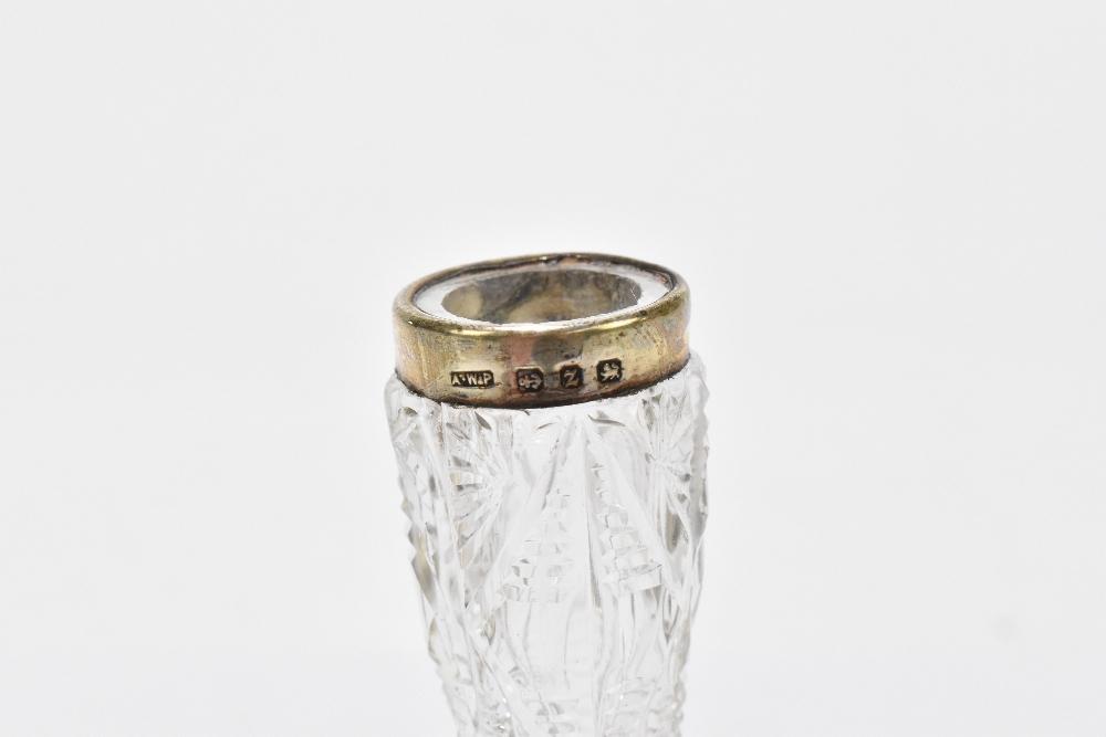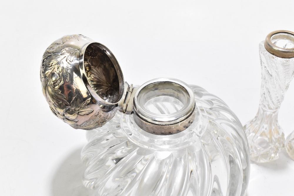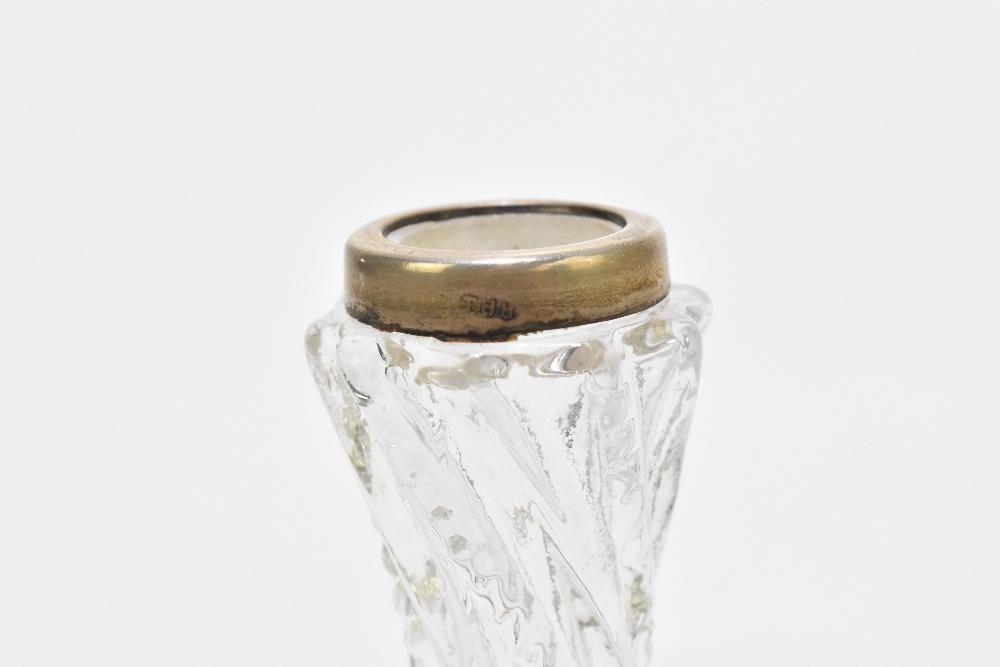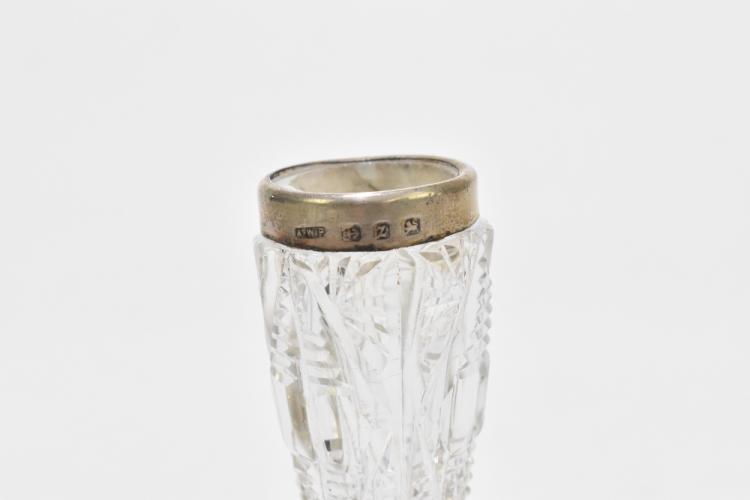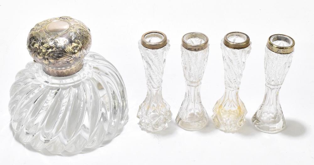 Lot 501 of 2356: ARTHUR WILLMORE PENNINGTON; a pair of cut glass posy vases with hallmarked silver collars, Birmingham 1899, two further example with white metal mounts and a large cut glass inkwell of circular form with silver plated collar and hinged cover (5).