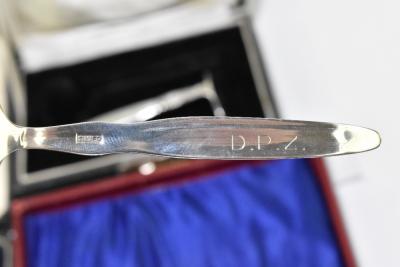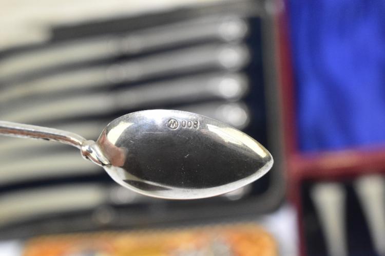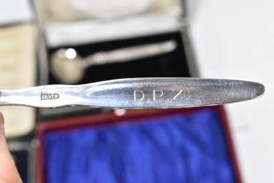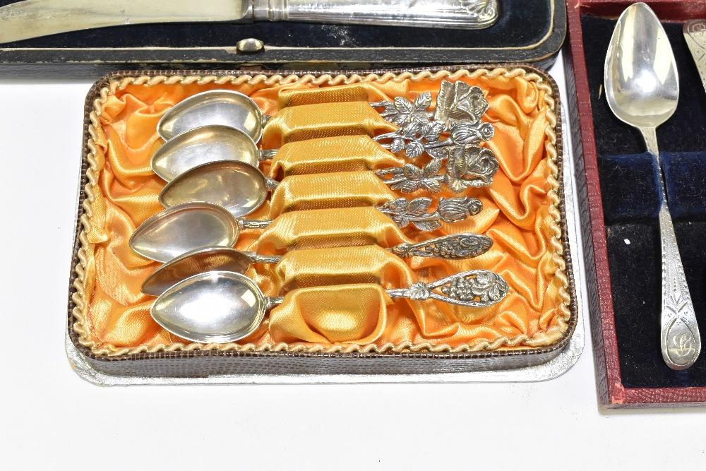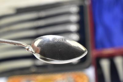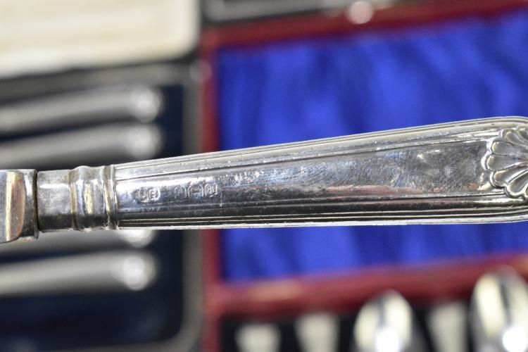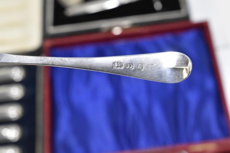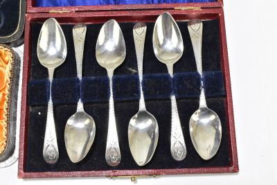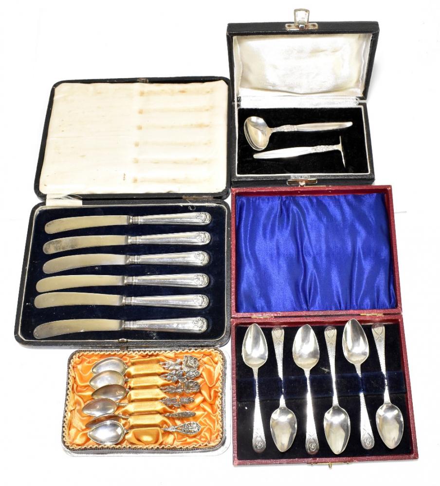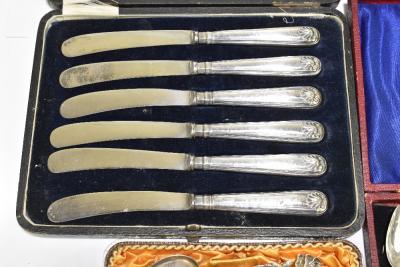 Lot 503 of 2356: A set of six George III bright cut decorated silver teaspoons, a set of six silver sheath handled steel bladed butter knives, a cased sterling silver baby spoon and push, and a cased set of six Continental teaspoons, various marks, combined approx. 5.7ozt/179g.
