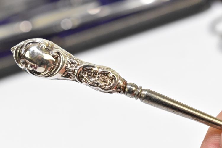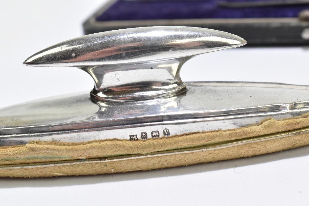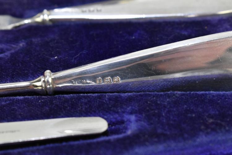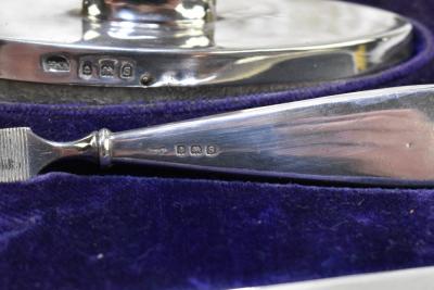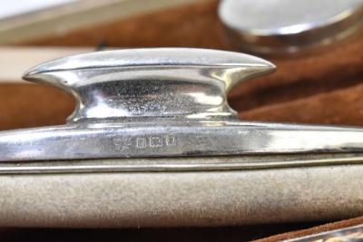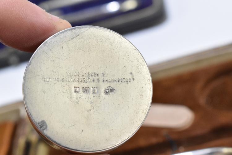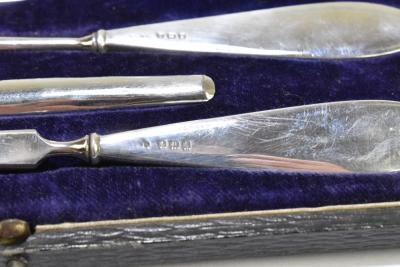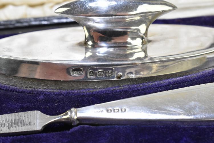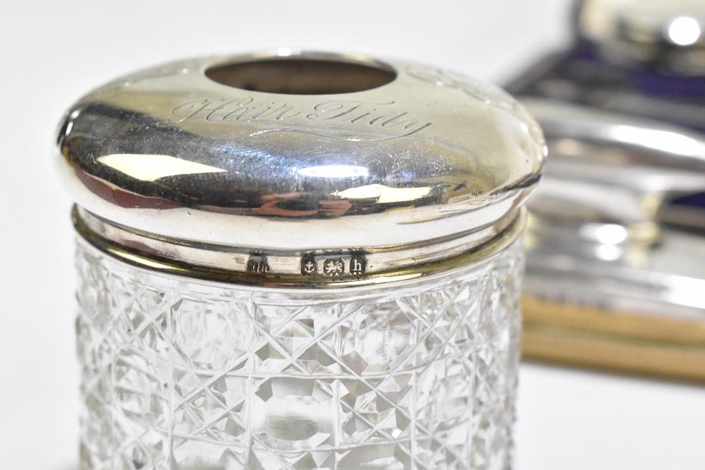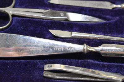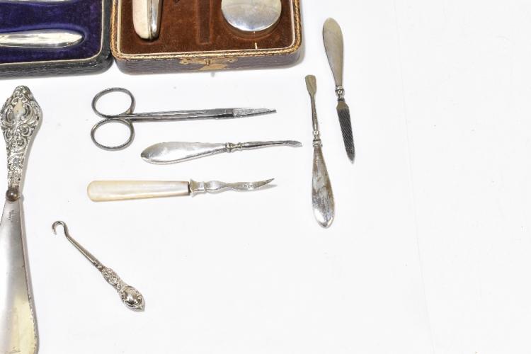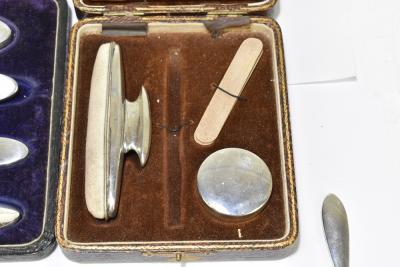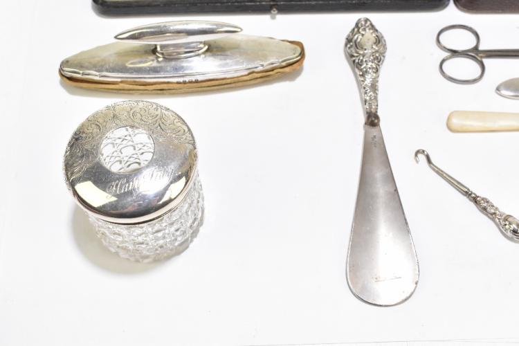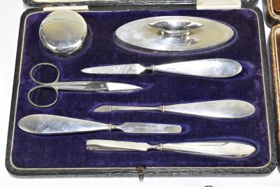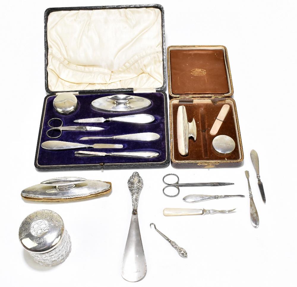 Lot 504 of 2356: HORTON & ALLDAY; a George VI hallmarked silver cased and steel bladed manicure set, further manicure items, a silver mounted buffer and a cut glass silver mounted hair tidy.