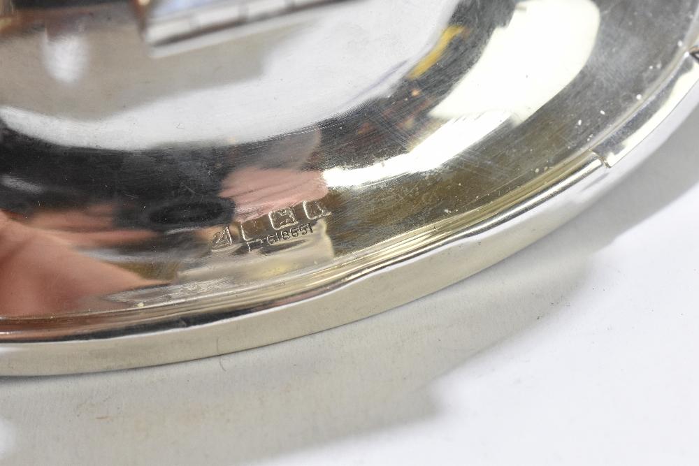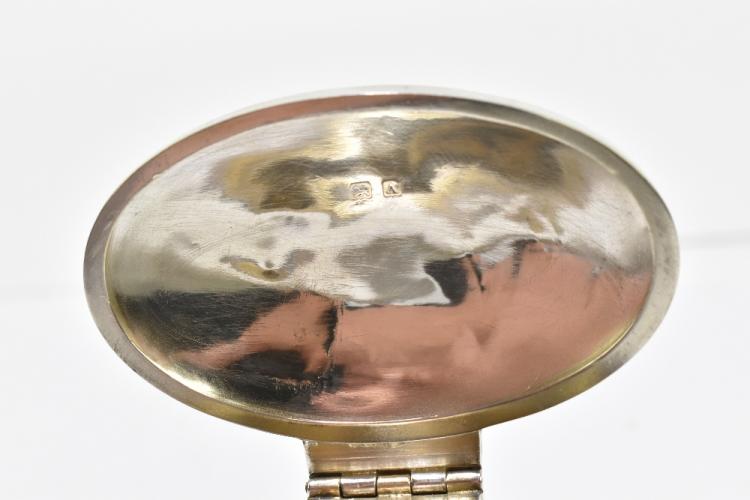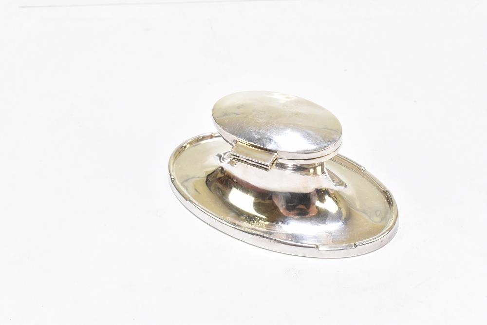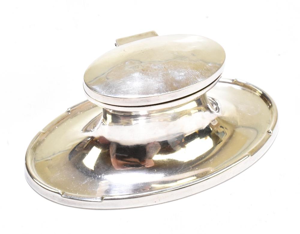 Lot 505 of 2356: A&J ZIMMERMAN; a George V hallmarked silver loaded oval inkwell with hinged lid, Birmingham 1925, width 13.8cm.