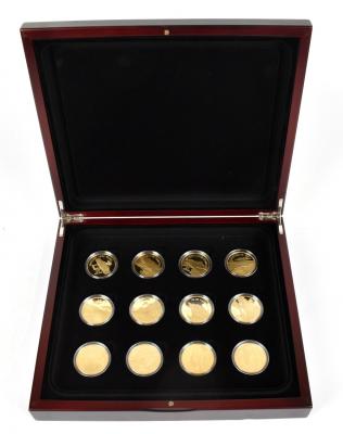 Lot 643 of 2356: A boxed set of twelve 2005 Soloman Islands Golden History of Powered Flight commemorative $25 coins, lacking certificates but believed to be gold plated silver Proof.