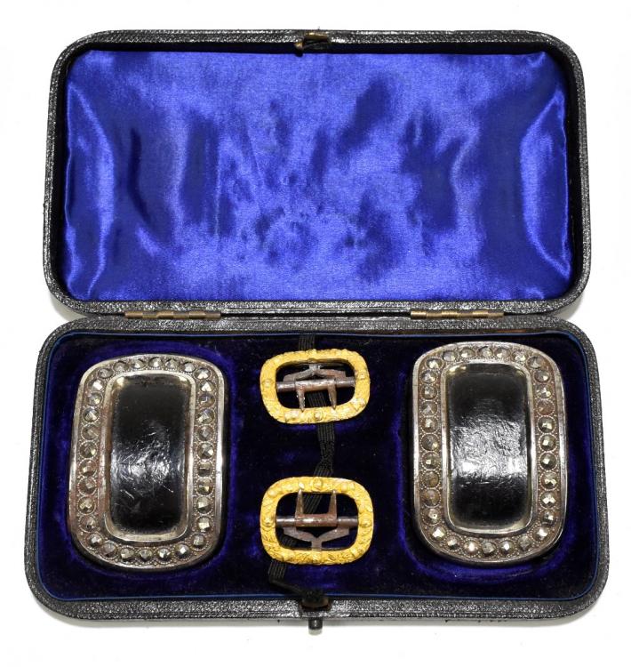 Lot 2111 of 2356: A cased pair of early Victorian cut steel buckles with a smaller gilded pair set to the centre of the box.
