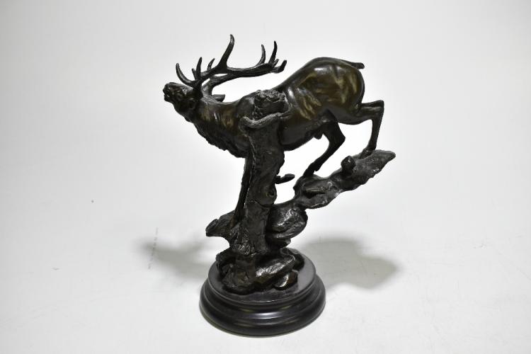 Lot 2114 of 2356: LOBE; a modern bronze figure group depicting a stag walking on a naturalistic setting, with applied foundry style mark inscribed 'Bronze Guarant, London', raised on marble plinth base height 30cm.