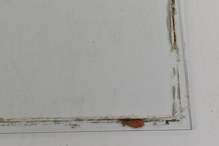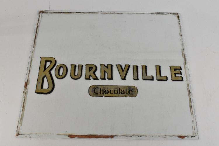 Lot 19 of 1211: An early 20th century Bourneville Chocolate advertising shop window pane with gilt and black lettering, 64.5 x 73.5cm.