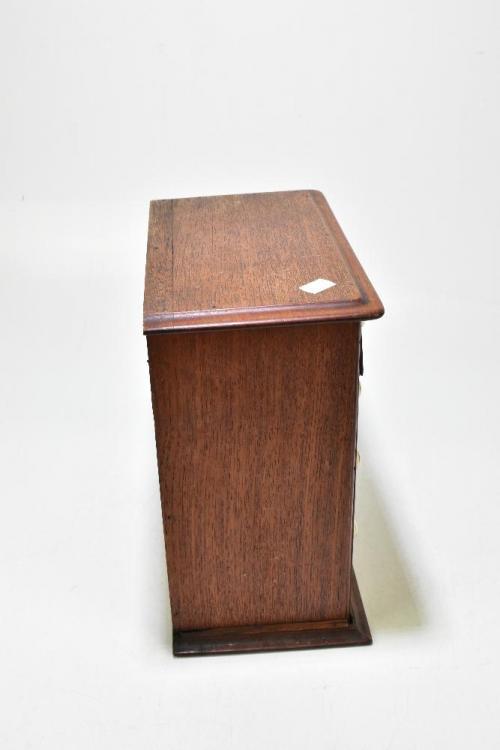 Lot 30 of 1211: A late 19th century mahogany miniature chest of two short over three long drawers, with ceramics handles, raised on plinth base, width 30cm, depth 17cm, height 31.5cm.