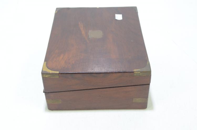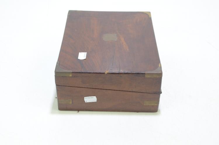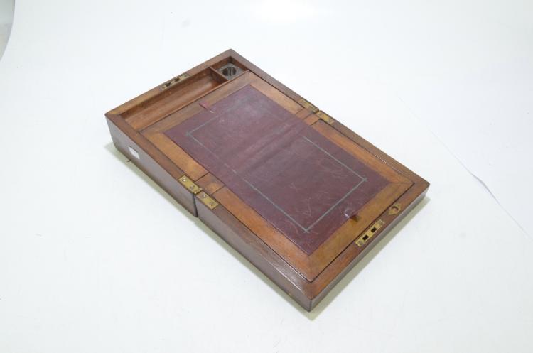 Lot 39 of 1211: A 19th century brass bound writing slope, the hinged cover enclosing slope and fitted compartments, with detachable moulded glass inkwell, length 27cm, depth 21cm.