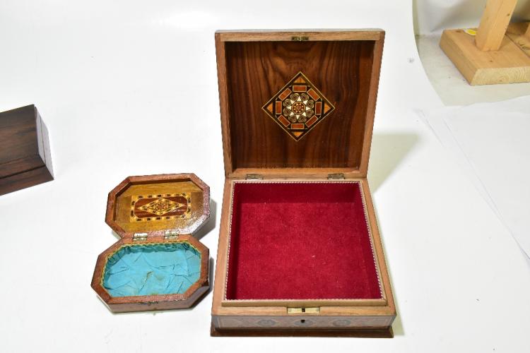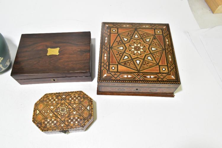 Lot 41 of 1211: A 19th century rosewood workbox, 23cm, with two 20th century Damascus mother of pearl and wood inlaid boxes, the square box length 24cm, the octagonal box length 16.25cm and a pair of Dudson jasperware type vases, height 18cm (5).