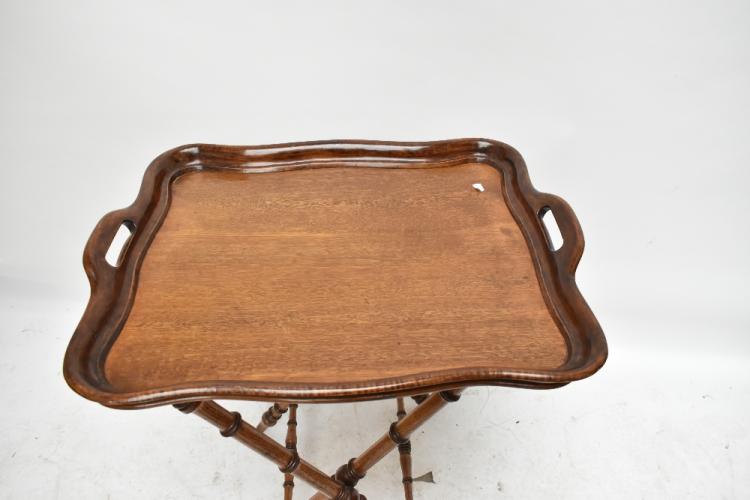 Lot 46 of 1211: A reproduction oak twin handled shaped rectangular butler's tray, raised on bamboo effect forming stand, height 86cm, length of tray 77cm.