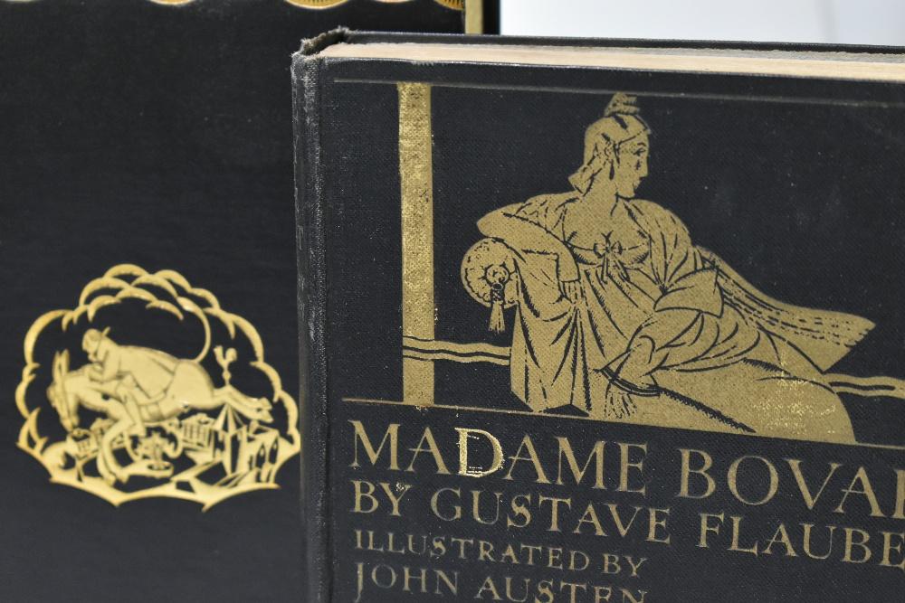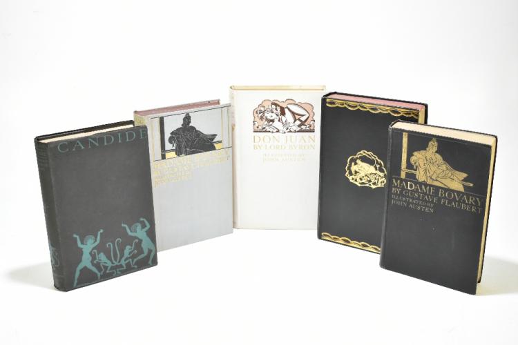 Lot 403 of 1211: QUINCEY (T), THE CONFESSIONS OF AN ENGLISH OPIUM-EATER, illustrated by Sonia Woolf, with pictorial d.j., green cloth, The Bodley Head Ltd, 1930; ADLINGTON (R), trans, CANDIDE AND OTHER ROMANCES BY VOLTAIRE, pictorial d.j. and black cloth, The Bodley Head Ltd, reprint 1929; FLAUBERT (G), MADAME BOVARY, illustrated by John Austen, pictorial blue cloth, The Bodley Head Ltd, 1928; AUSTEN (J), illus, DON JUAN BY LORD BYRON, pictorial white cloth, The Bodley Head Ltd, 1926; STERNE (L), THE LIFE OF TRI