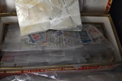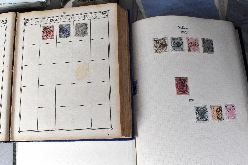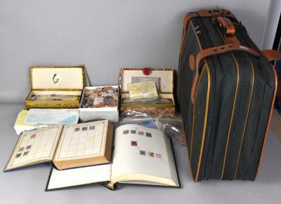Lot 590 of 1211: Suitcase of 6 albums sparsely filled, GB, World and Commonwealth, mostly used, duplication; note book with GB KGVII & GVI, used, plus loose, thousands of stamps.
