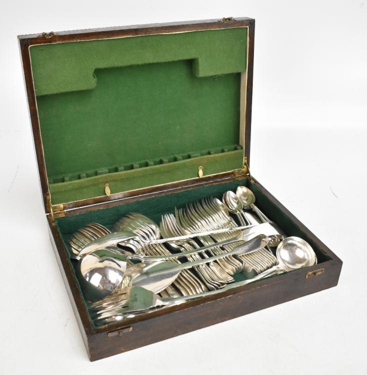Lot 1112 of 1211: MAPPIN & WEBB; an oak cased silver plated canteen of cutlery, together with two further silver plated canteens of cutlery to include a King's pattern example fitted in associated mahogany canteen.