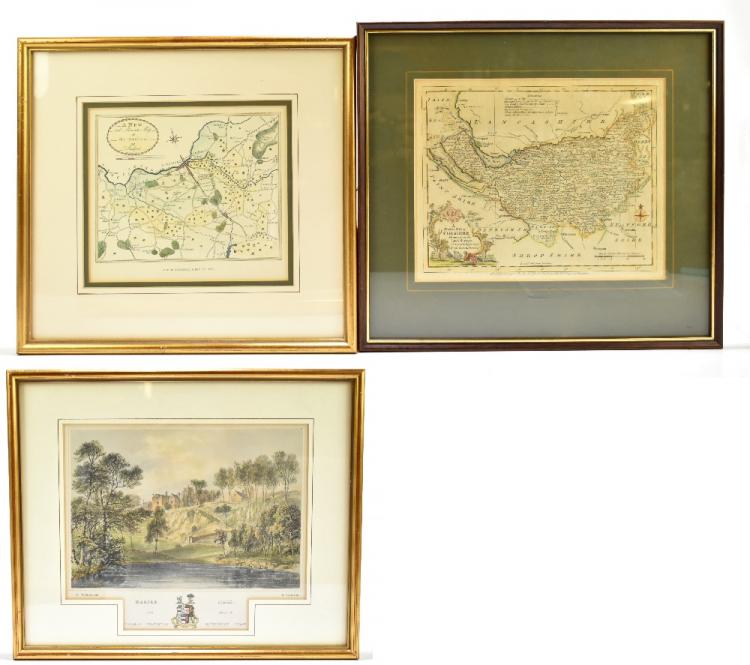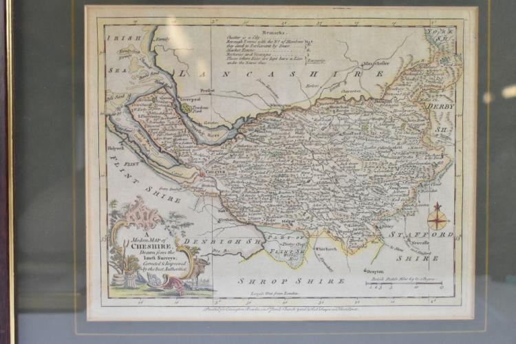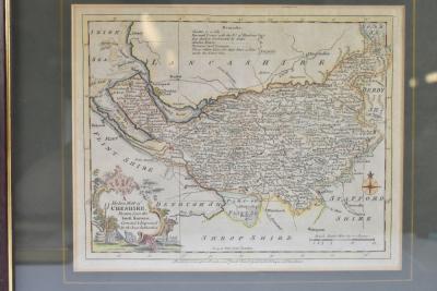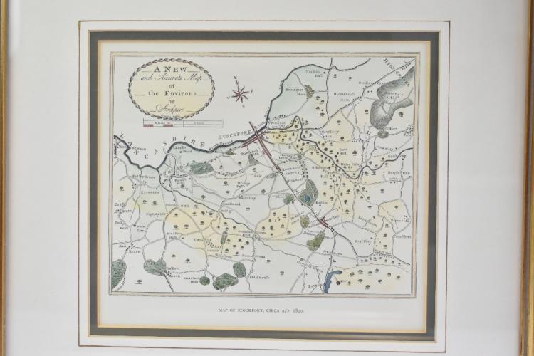 Lot 1115 of 1211: 'A Modern Map of Cheshire, Drawn From the Latest Surveys [...]' printed for Carington Bowles of Fleet Street, 19 x 24cm, a reproduction map of Stockport and a further reproduction coloured print 'Marple Hall', all framed and glazed (3).