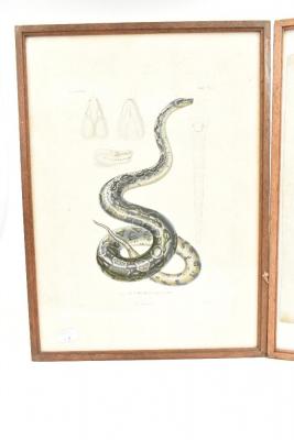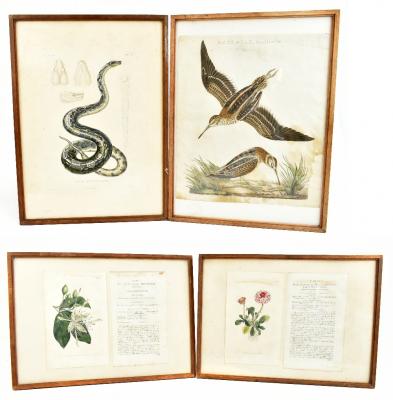 Lot 1118 of 1211: Four 19th century coloured engravings comprising a French study of a snake, 'Boa de Chevalier', 32 x 24cm, a bird study, 'Scolopax, Gallinula' and two floral examples, 'Sweet-scented Srataeva' and 'Great Double Daisy', presented with corresponding pages, all framed and glazed (4).