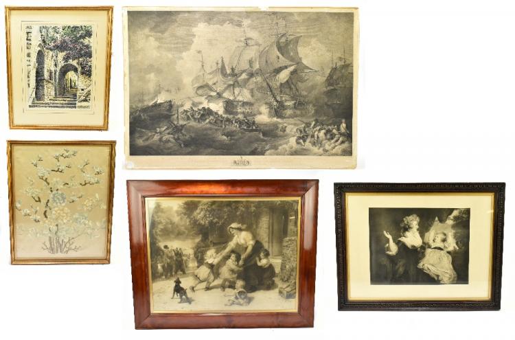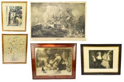 Lot 1120 of 1211: JAMES FITTLER AFTER LOUTHERBOURG; black and white engraving, 'The Glorious Victory Obtained Over the French Fleet by the British Fleet Under the Command of Earl Howe on the 1st June 1794', mounted onto a later board, published January 1st 1799, 58.5 x 81cm, with two other black and white prints, a modern print and a framed Chinese textile panel (5).