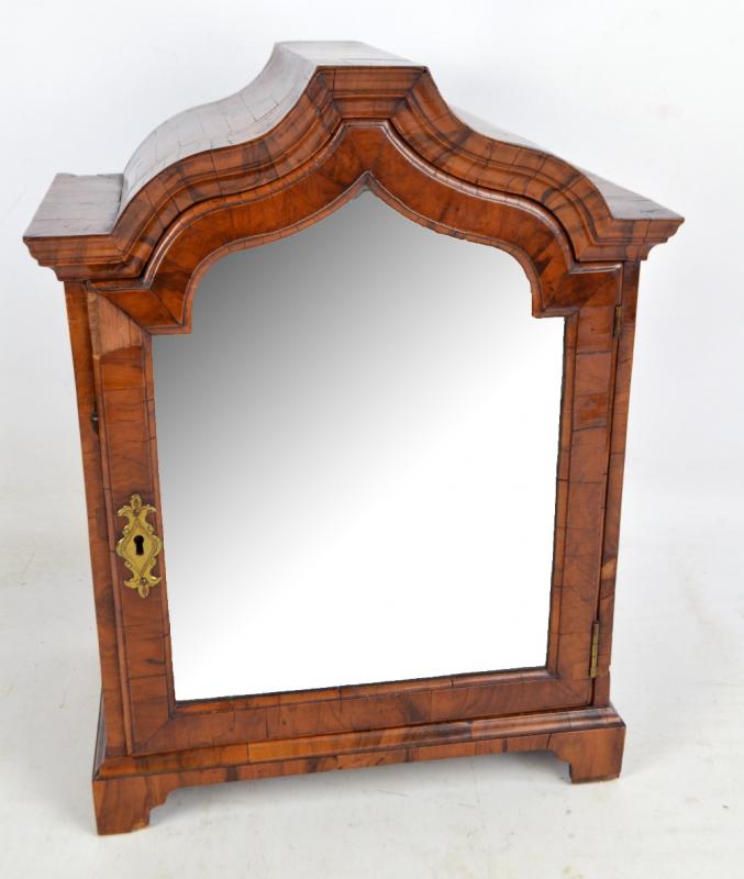 Lot 12 of 1789: A late 19th century walnut veneered table top cabinet with single arched and mirrored door enclosing a formation of eleven variously sized drawers, on bracket feet, height 43.5cm (af).