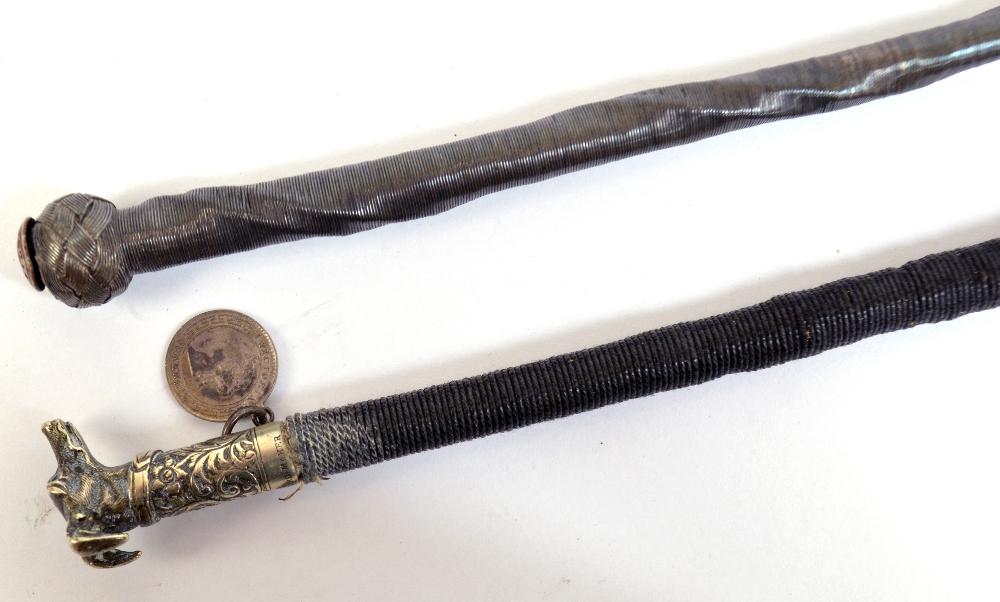 Lot 50 of 1789: A good and unusual lady's carriage whip, with white metal dog's head finial, inscribed 'Ashford Maker' with foliate scroll decorated band beneath the hound's head, length 74cm and a further lady's carriage whip with white metal twisted grip and button inscribed 'Ashford, London', length approx 56cm (2).
