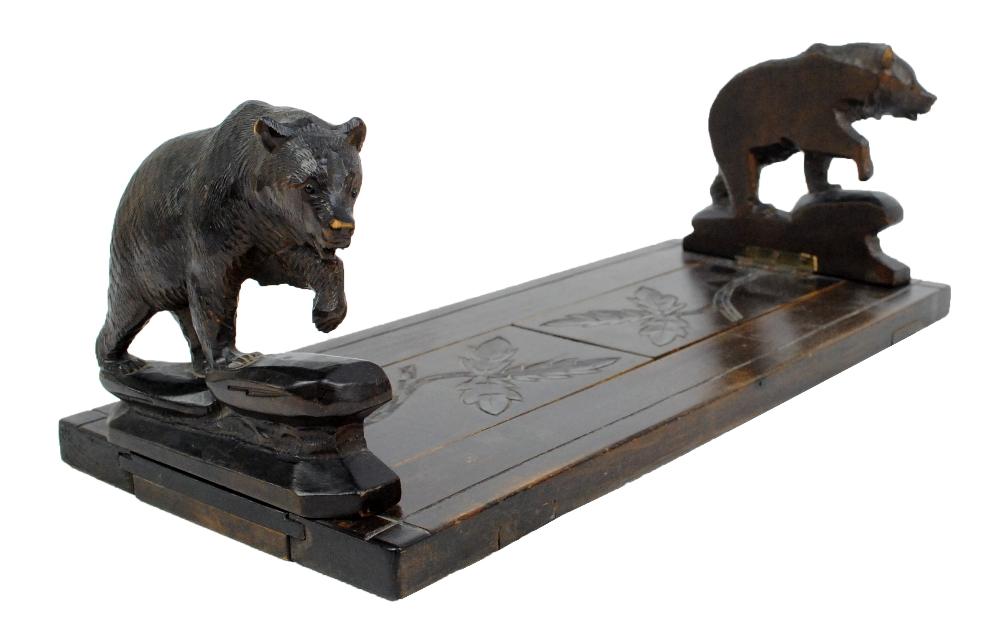 Lot 68 of 1789: A Black Forest book slide with hinged bears on rocks at either end, the slide decorated with a twig and leaf motif, width when closed 35cm.