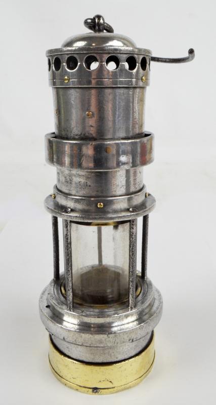 Lot 106 of 1789: An early 20th century unnamed nickel and brass miner's safety lamp, height 25.5cm.