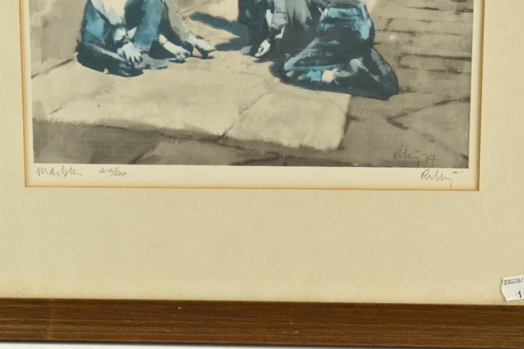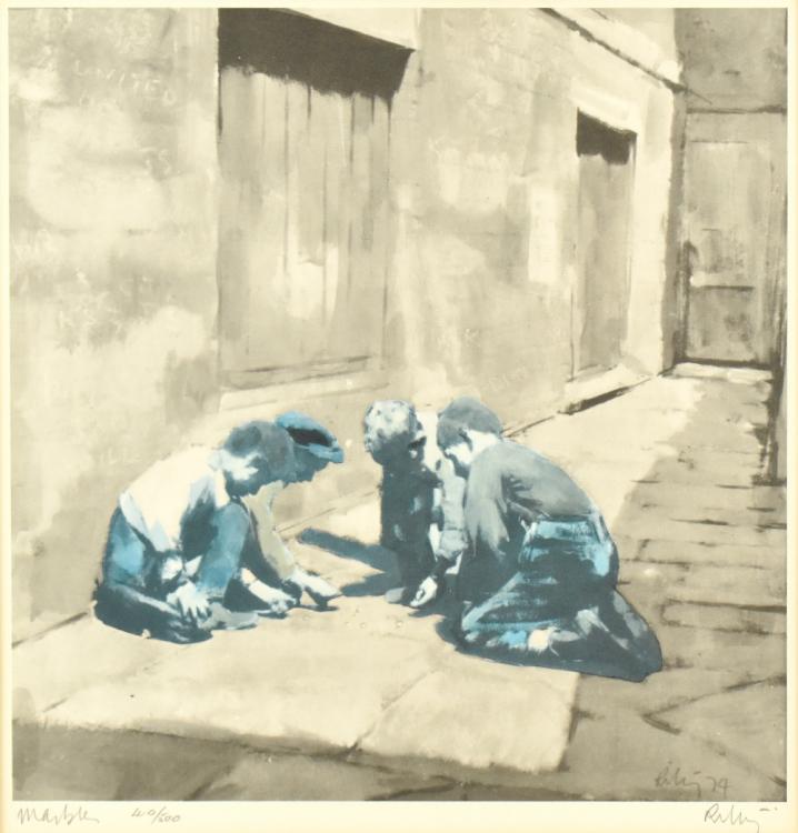 Lot 11 of 2039: HAROLD FRANCIS RILEY DL DLitt FRCS DFA ATC (born 1934); limited edition signed print, ‘Marbles’, four boys playing marbles on the street, 40/500, published by Grove Galleries Ltd Manchester, 29.7 x 29.1cm, framed and glazed. (D)