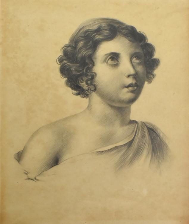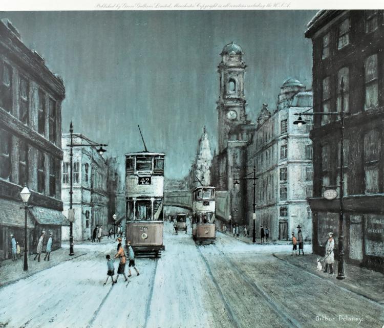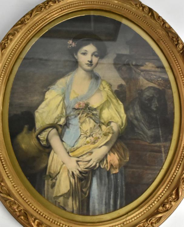 Lot 14 of 2039: AFTER ARTHUR DELANEY; colour print, Manchester street scene, 39.5 x 47cm, with a pair of 19th century coloured prints of maidens, in foliate oval frames, overall height 59cm and a pencil sketch of a maiden (4).