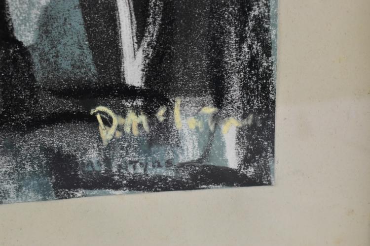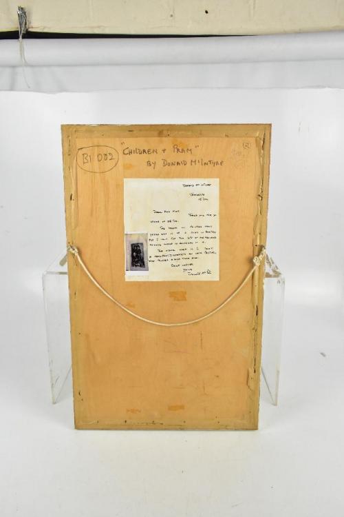 Lot 24 of 2039: DONALD MCINTYRE (1923-2009); monoprint with pastel highlights, 'Children & Pram', bears letter from McIntyre verso, 'Dear Mrs King, Thank you for your letter of 19th Decoration, the large oil painted many years ago is of a road in Anglesey but I cannot for the life of me remember exactly where in Anglesey it is, the other work is, I think, a monoprint I worked on with pastel, also painted a long time ago, best wishes, yours, Donald McIntyre', 50 x 29cm, framed. (D)
