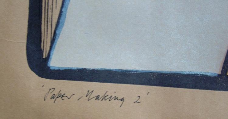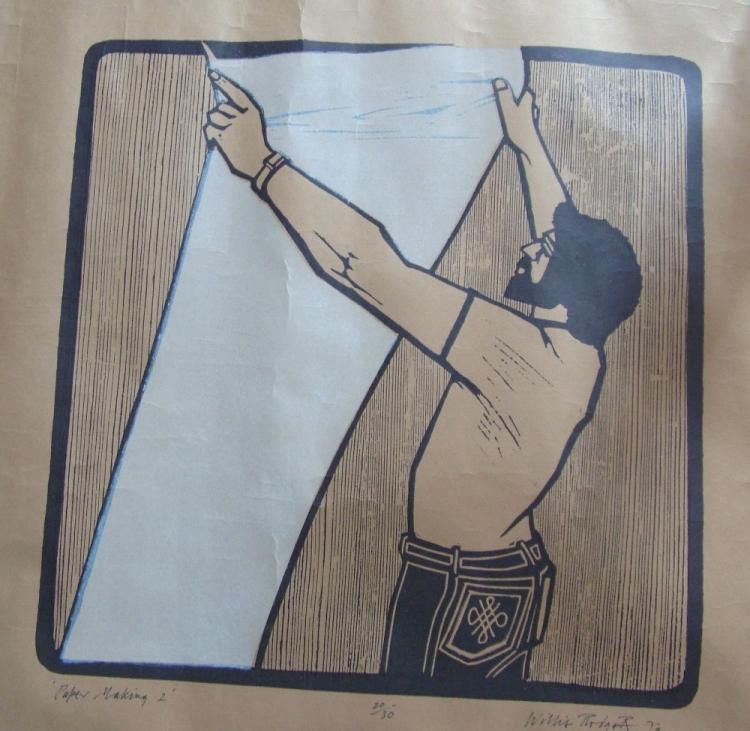 Lot 37 of 2039: WILLIE RODGER RSA (1930-2018); pair of limited edition wood cuts, 'Paper Making I' & 'Paper Making II', 19/30 and 20/30 respectively, both signed and dated 1979, image 38 x 38cm, overall 71 x 96cm, unframed (2). (D)
