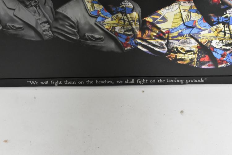 Lot 40 of 2039: DIRTY HANS (Contemporary British); original colour print on faux canvas, 'Winston Churchill', signed lower right, 70.5 x 122cm, in titled frame, additionally lettered at the bottom 'We will fight them on the beaches, we shall fight them on the landing grounds'. (D)
