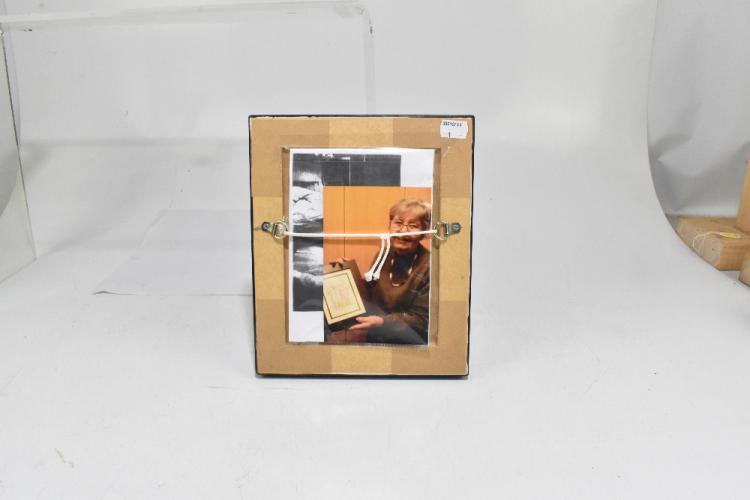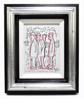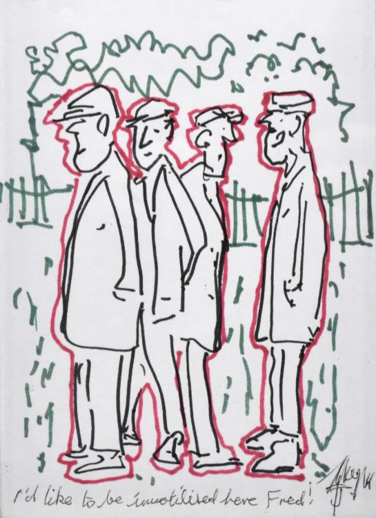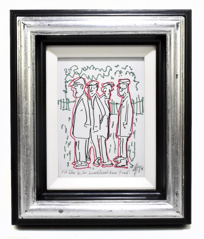 Lot 84 of 2039: JOHN THOMPSON (1924-2011); ink drawing, 'I'd Like to be [indistinct] Here, Fred', signed lower right, 14 x 10cm, framed and glazed, with a photograph of Mrs Thompson holding the image. (D)